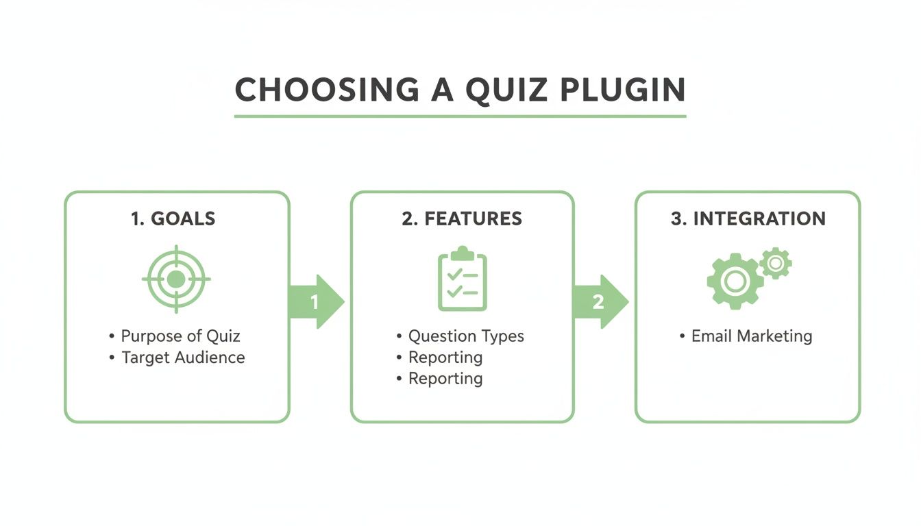 This is the process flow for selecting a WordPress quiz plugin that aligns your goals with the right features and integrations.