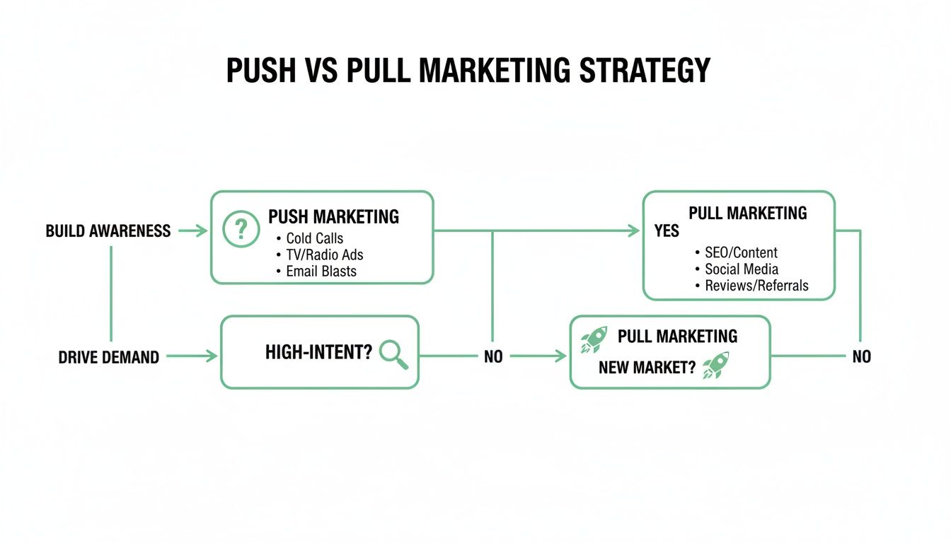 As the flowchart shows, pull marketing is your go-to for capturing existing, high-intent demand. Push marketing is what you need when you're breaking into new markets or just trying to build awareness from a cold start.