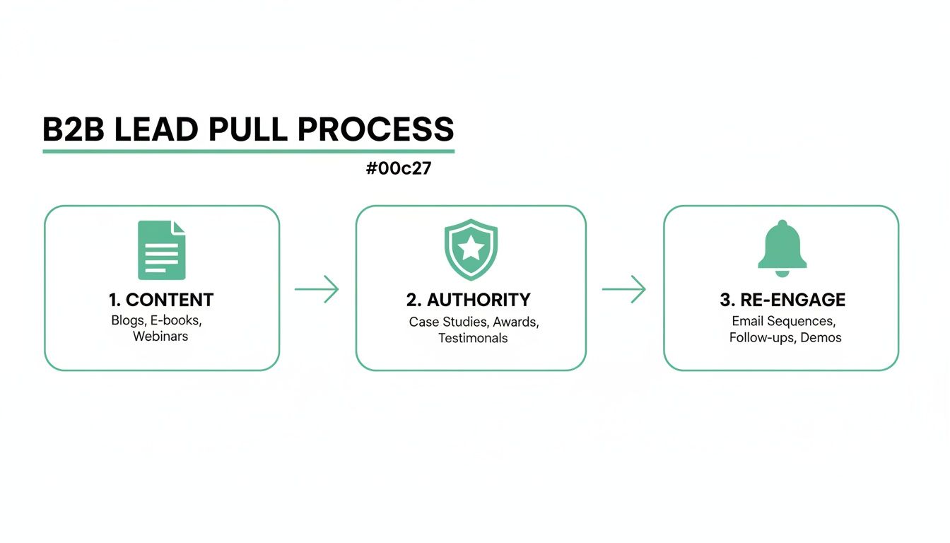 The diagram makes it clear: you start by giving value away (Content), which builds trust (Authority), and then you keep the conversation going (Re-engage). That’s the core of a modern pull strategy.